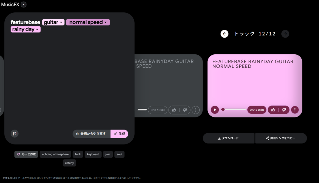また、DJモードについても触れてみました。10個までのキーワードをスライダーで調整できるのですが、「Cyberpunk」の要素を強めたり「Rain sound」を足したりと、リアルタイムで変化していくのが面白いです。音楽の知識がなくても、直感的に音を操作できるのは新しい体験でした。
